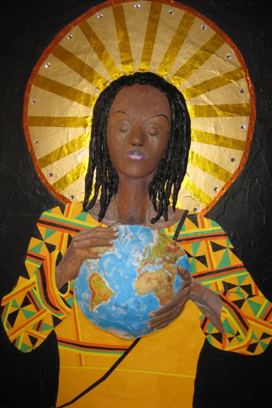 mixed media, half flat half high relief and sculptural. I am making a built-on frame for this piece and will be repainting parts of her…also possibly adding some jewelry, half relief and half not.