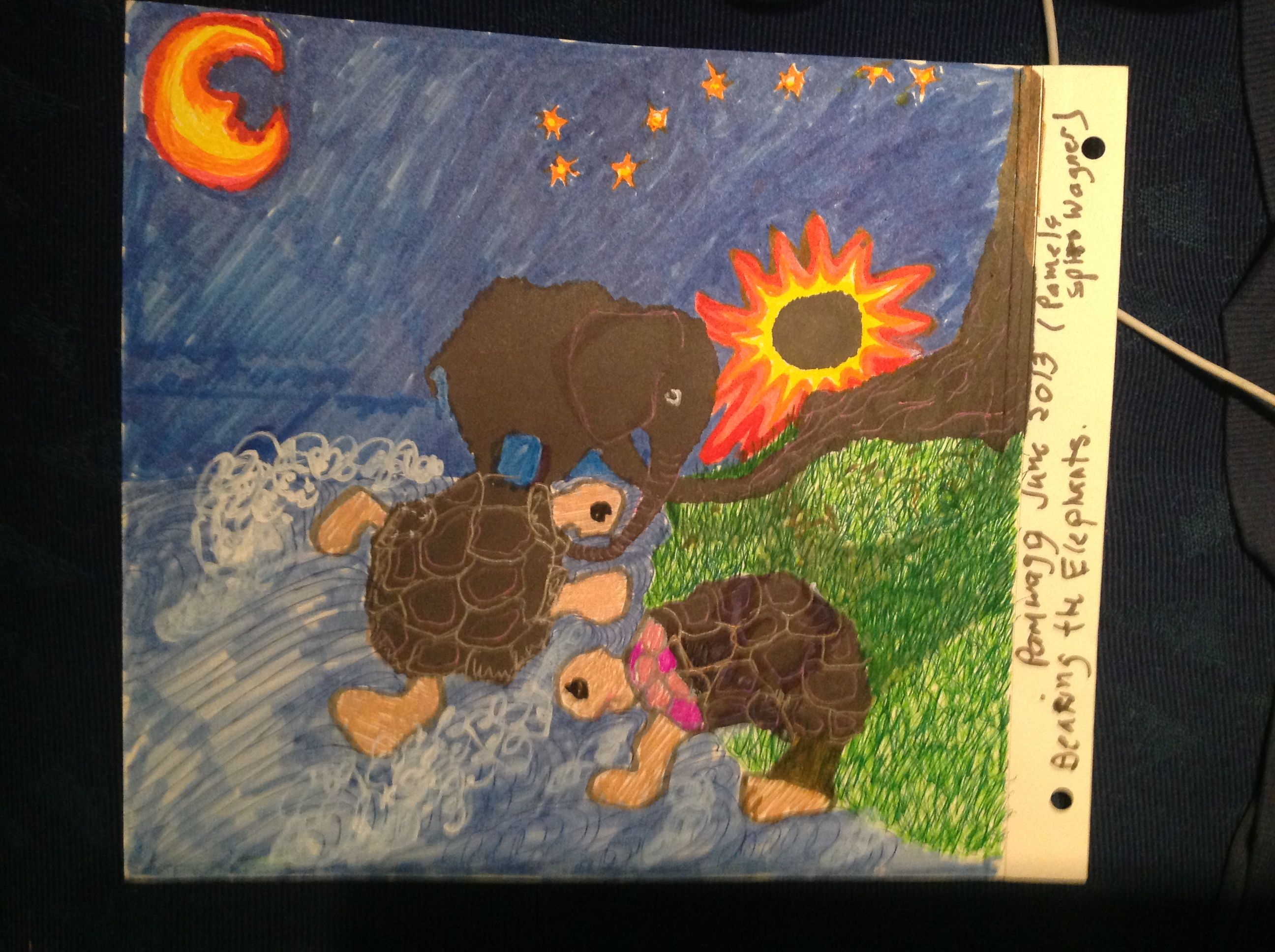 I call this Bearing the Elephants but it was just what I saw in the inkblots. I gave it to a little girl called Bela on the train to NC two weeks ago. Make of it what you will!