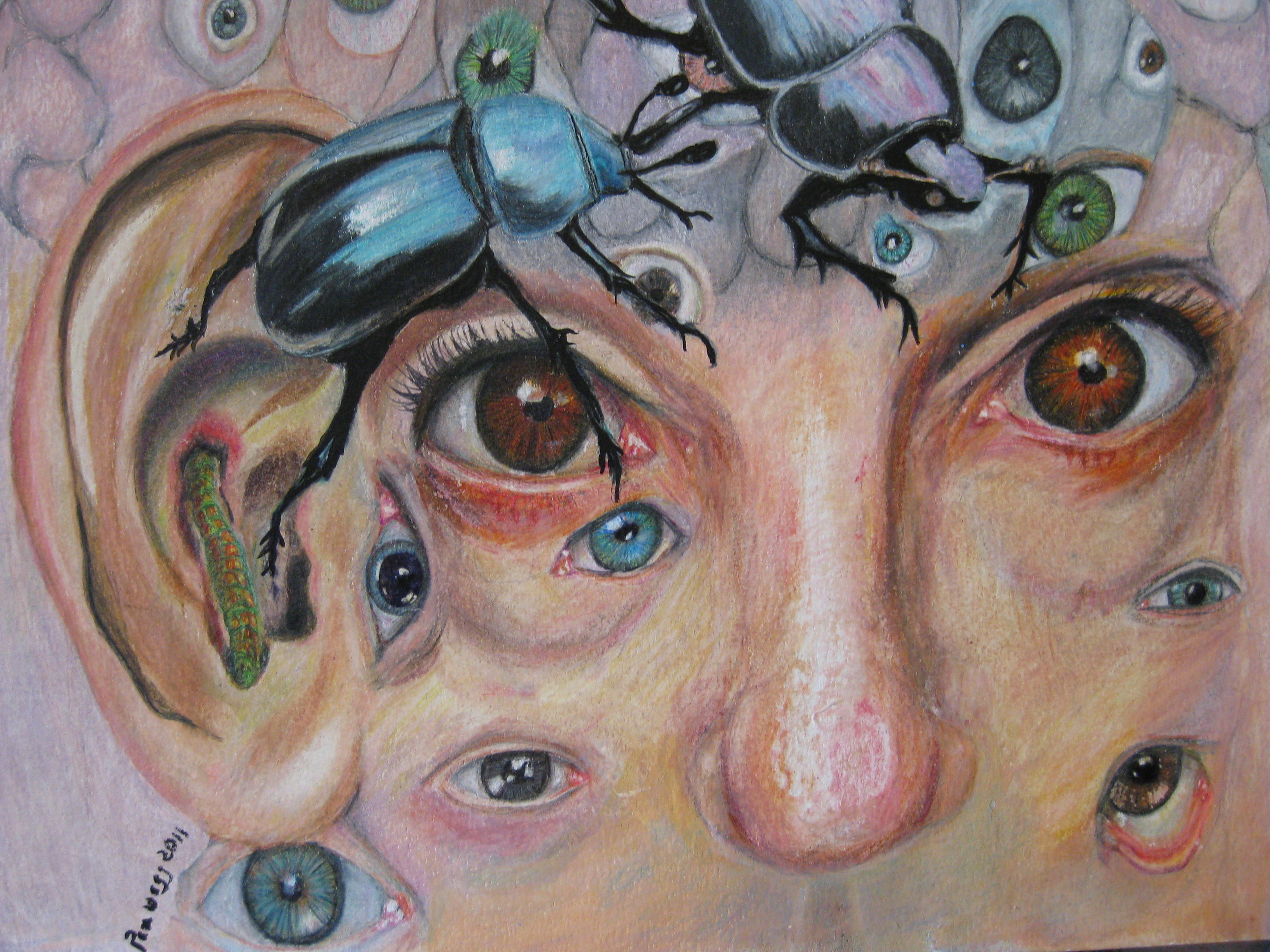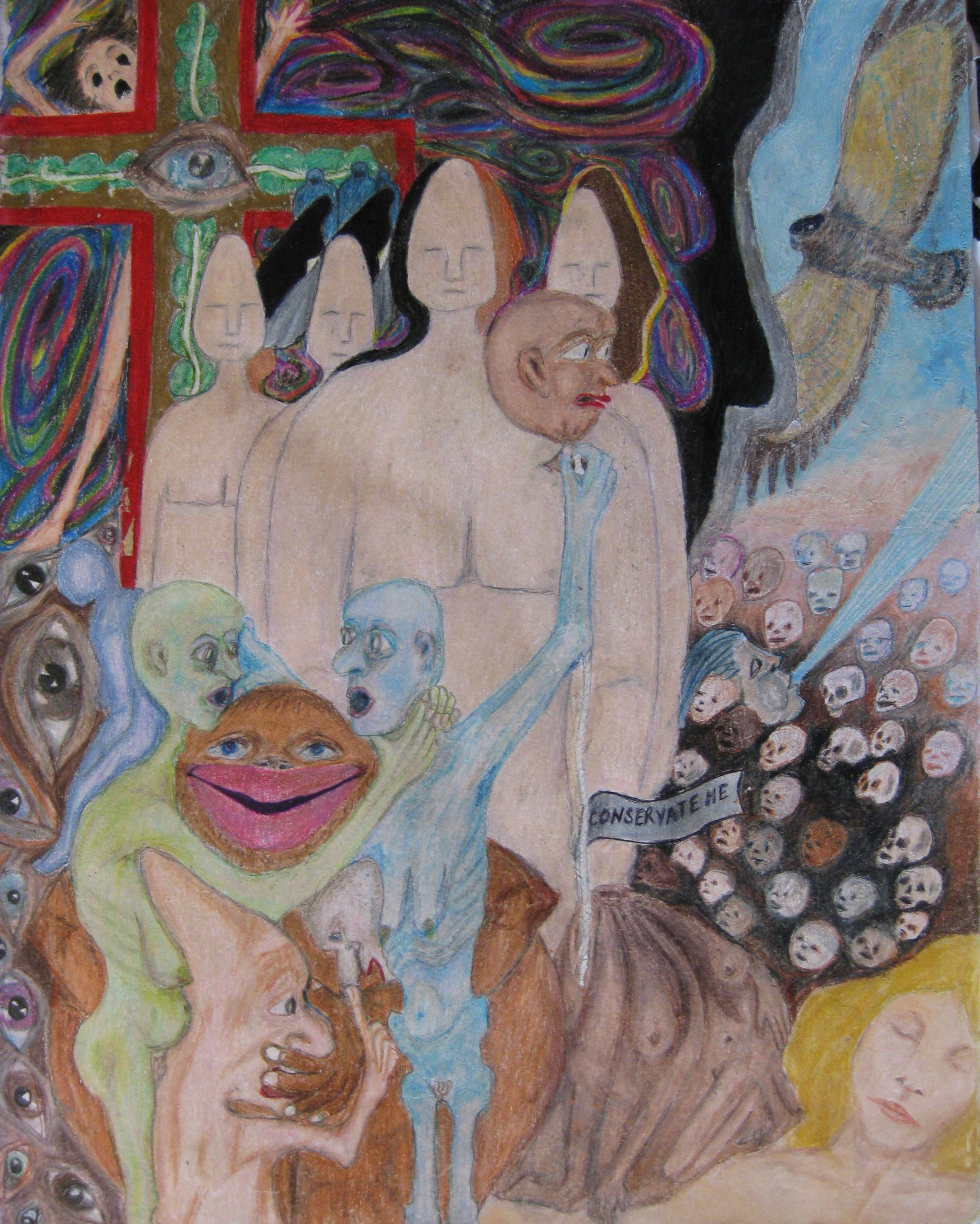 I did the last two of these at Natchaug Hospital this past winter, both of which may be obvious. The first, Under Attack from All Sides, was meant to express how I felt at the time, with the fingers pointing at me literally showing what the voices do, and the red high heel with a hand, strong, hefting that lethal looking spike — well those both belong to a certain someone I cannot name who wants me deader than dead and will do anything in her power to achieve it.