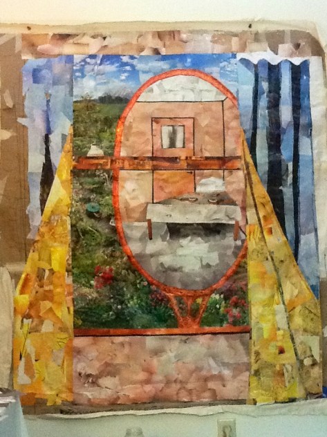 so I will leave it here, with the photos of the art. I will add only that I plan to redo the curtains, since as it is the blue competes with the sky. Also there will be a curtain rod, and such…But as you can see, it is still a work in progress!