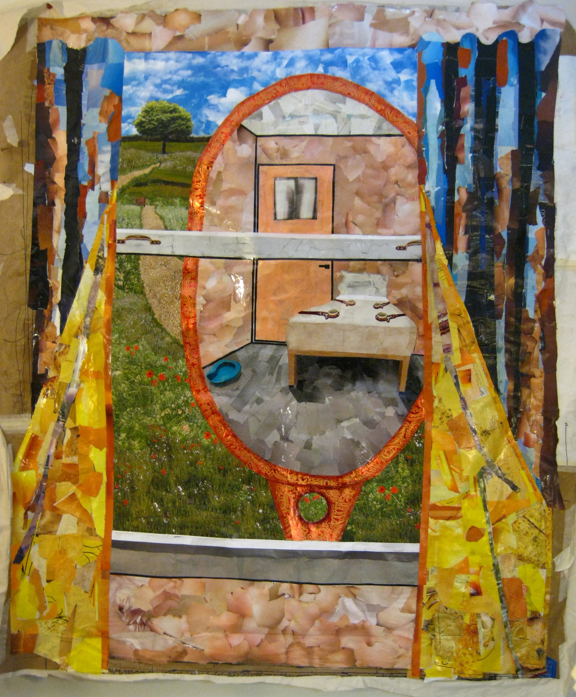 I started this collage at Natchaug Hospital in Willimantic, using scraps torn from magazines and glued onto a large sheet of brown paper. This was my effort to deal with the emotional trauma associated with other hospitals where I had been far too frequently shackled in four-point restraints. Although I have tried to depict a seclusion room realistically, I have also taken some artistic license: in a real such situation, the restraint bed would be facing the door, so that an aide or nurse monitoring the patient would be able to see his or her face clearly. And here, of course, the window is neither heavily grated nor closed. Instead, it has been opened (how? by whom?) and we see a winding path that leads far away…