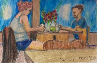 Here is a little new art to entice, just a small drawing i did while at fhe hostel in Boston during the Hearing Voices Congress. I hope to post that power point soon.