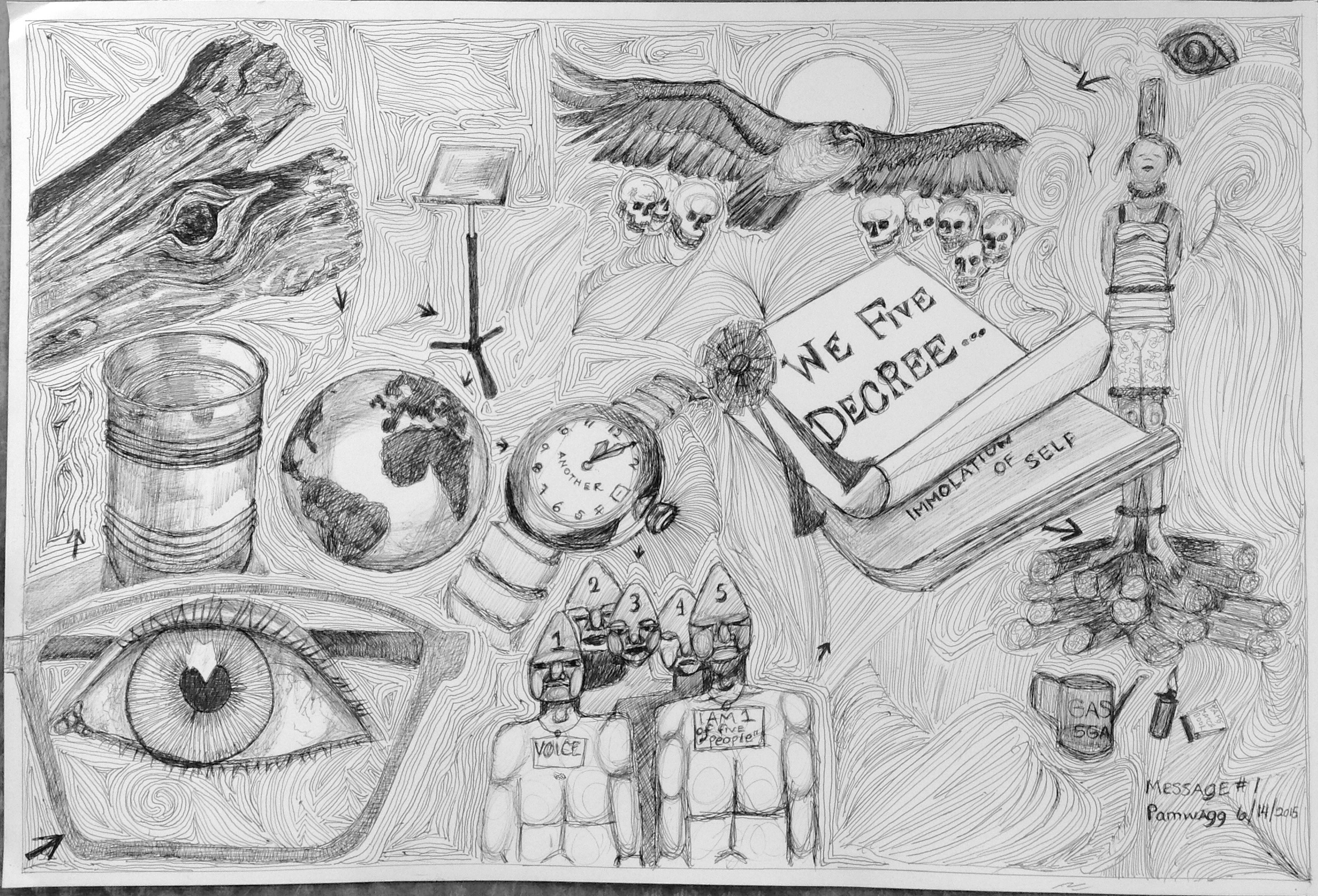 This was done with bendable safety ball point pen, all that the first hospital unit would permit me to use.... You read it from the left bottom upwards following the arrows. Hint: the upper left is a knot, not just wood.