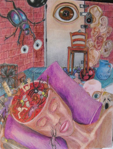 Angry at me, possibly justifiably, for slamming the door on him (I had been brutally restrained and secluded in the ER for NO reason the night before) the doctor put me in four point restraints the first day I was there, freezing cold and thirsty , in physical pain, and mute…No one responded to my plight. This drawing picture got stained from my efforts to save it from the trash, because every time they put me in seclusion the nurses would tell Housekeeping to throw my art and journals away. “It ‘s just trash” they would tell the cleaning woman, even though I begged them to preserve my work. Finally I wised up and mailed out everything I wrote and drew to my friends on the outside. Also I should mention that my rage at Dr Balkunas stemmed from his walking in to my room and pointblank telling me he would not let me communicate with a pen and paper, and would not sit with me at all unless I spoke with him…so my  rage, both from the restraints the night before and his  brutal dismissal of me, just exploded.