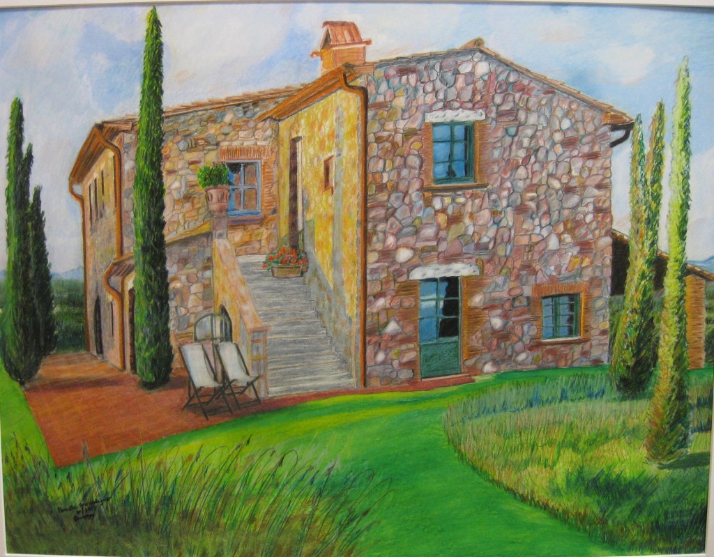 Coeur de France language school (for French ) in Sancerre, France. A rainy day…A more sunny day in Sancerre, 2019House on Bullock Street is a shade of purple or aubergine, not the blue it appears in photo.In acrylics, the same house is rather brighter! I hope owner, for whom I painted it doesn’t mind…Palazzo Podere in Tuscany ItalyMy version of this lovely house, approximately 32” by 24” done entirely in colored pencils.