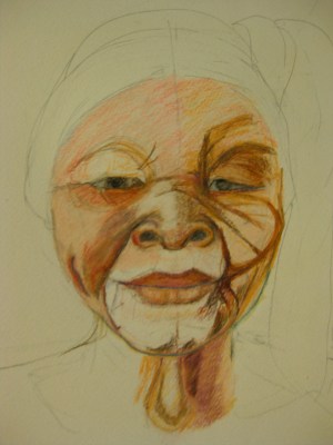 A technique I am learning/teaching myself is one I thought I would never understand, let alone be able to do and that is how to do a kind of underpainting of whites or light colors, the highlights, before adding the darker tones. I do not know, of course, if one is actually supposed to do that with colored pencils, but I did so anyway, figuring it might be time to try it. So given the original sketch to work with, I then heavily applied light peach and white tones where you can now see the lighter areas on the face, and only much later softened them with the darker chestnut browns and darker umbers, though clearly much peach shows through where the light is meant to strike the face on the left.