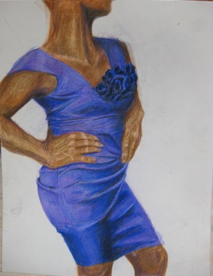 Both of these drawing are done entirely in colored pencils. I used a colorless blender sometimes, but mostly used either white or a lighter color on top of the other colors in order to “smooth” out certain surfaces, and on others, like the black fleecy top that Adriane wears, I used only the technique of drawing tiny circles in black on top of indigo blue, to imitate the texture of nubbly fleece.