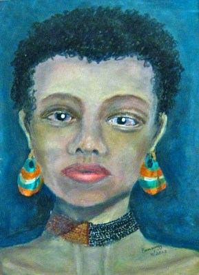 Those of you who are familiar with my “older”works (meaning the ones I did in 2009 when I first started painting) might recognize the earlier piece, more recently uploaded, called Woman with Earring, or Sister Soulidad. Well, this painting is a palimpsest of that one, a palimpsest being simply a painting over another painting. You can see hints of the old one underneath this one, indeed, as the earrings are the same, as is the necklace and even the lips. Even though the rest of the face is much changed, nevertheless there are definitely echoes of Sister Soulidad in her.